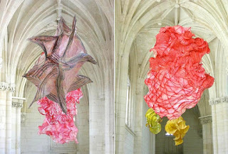 Il nous dit qu'en maîtrisant au séchage les tensions et les contractions de la pulpe et de fines ossatures de bambou, le papier s'enroule comme une feuille d'automne générant des sculptures pouvant atteindre de grandes dimensions, monde fantomatique porteur de rêve.